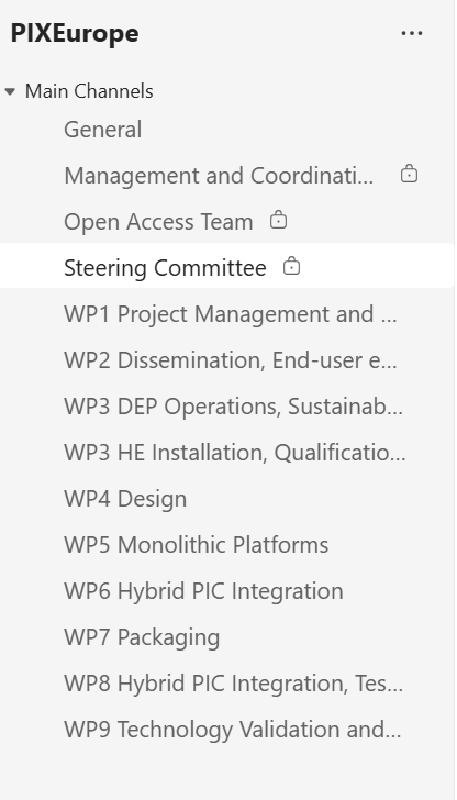 The TEAMS channels are open to all the PIXEurope members, except the ones dedicated to the coordination and management (Management and Coordination Team channel, Steering Committee channel and Open Access Team channel).